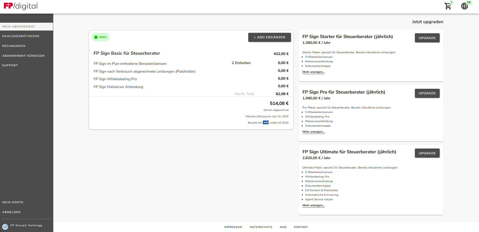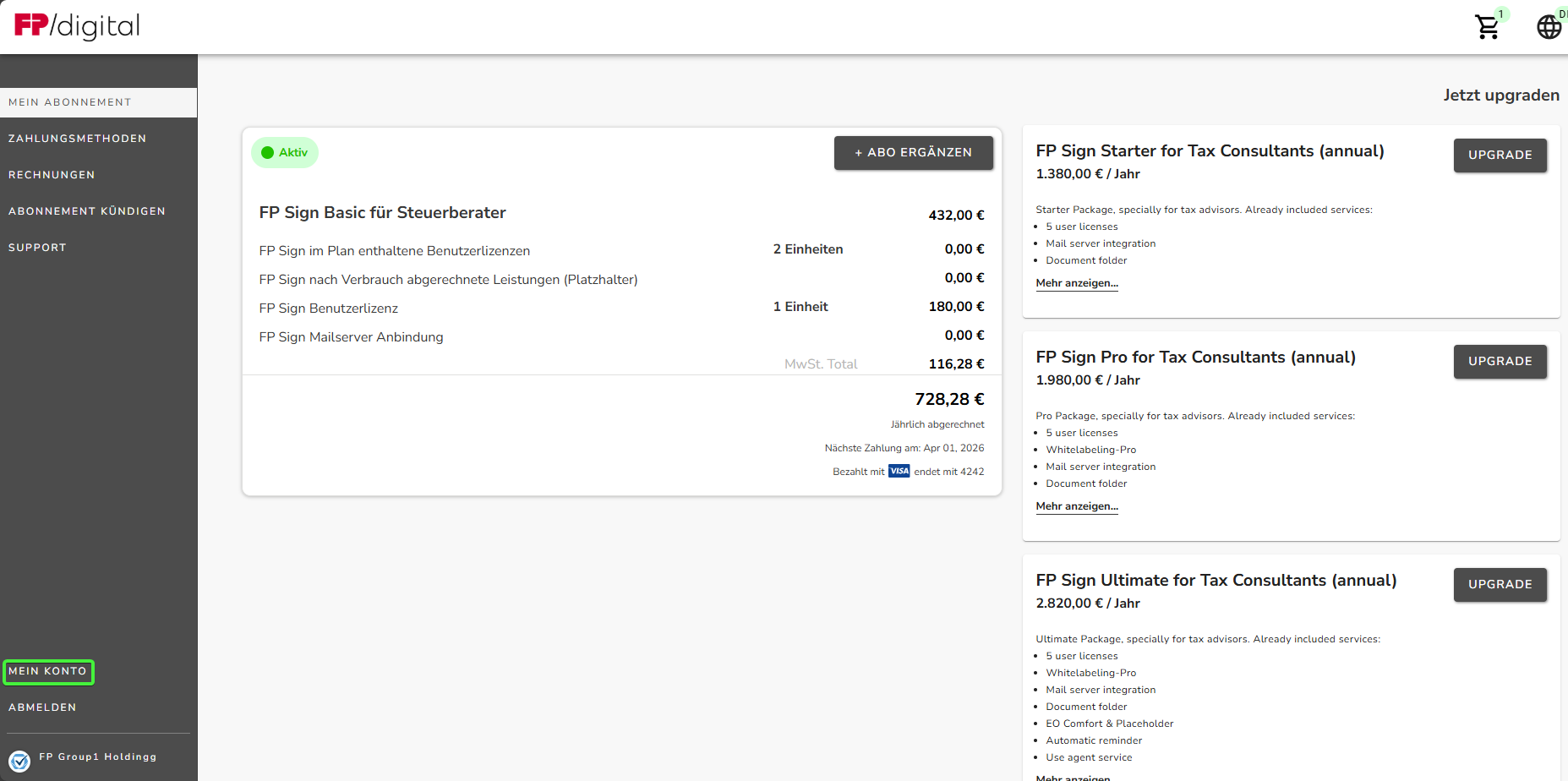 Der Einstieg in das Self-Service-Portal ist denkbar einfach: Direkt von der FP Sign Admin-Seite aus gelangen Sie mit einem Klick auf „Abrechnung und Vertrag“ zu allen relevanten Funktionen - ein zusätzlicher Login ist nicht erforderlich. Die Navigation auf der linken Seite führt Sie direkt zum Ziel: