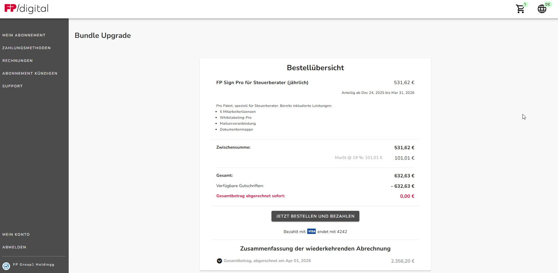 Für alle, die sich mehr Flexibilität im Bestell- und Lizensierungsprozess unserer Produkte gewünscht haben, gibt es jetzt unser Self-Service-Portal von FP Sign. Damit bieten wir Ihnen maximale Transparenz bei der Verwaltung Ihrer Abonnements - ohne Umwege, ohne zusätzliche Logins und ohne unnötige Klicks.