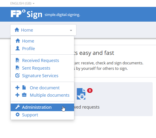 - Alternatively, you can also go through the dropdown menu of the FP Sign portal and select the bottom item Administration. You will now be redirected to the admin portal.
