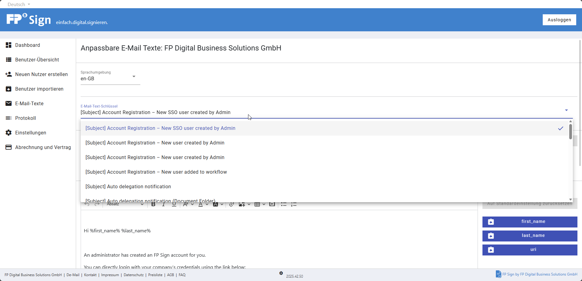 Please note: The functions described in this article require administrator rights in your FP Sign tenant. Only administrators can access the administration portal and edit the email texts.